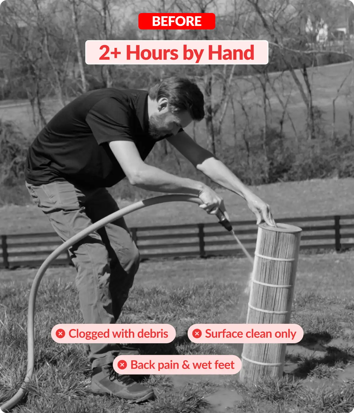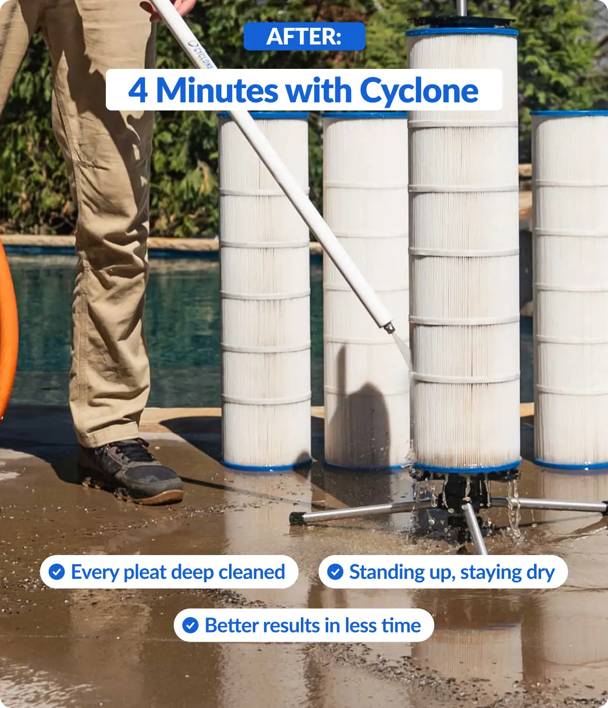 On average, customers cut cleaning time by 50%. Many report 4-5× faster. Example: If 4 quad filters took you 2+ hours manually, they'll now take 15-20 minutes with Cyclone. Results vary based on how dirty your filters are and your water pressure, but everyone saves significant time.